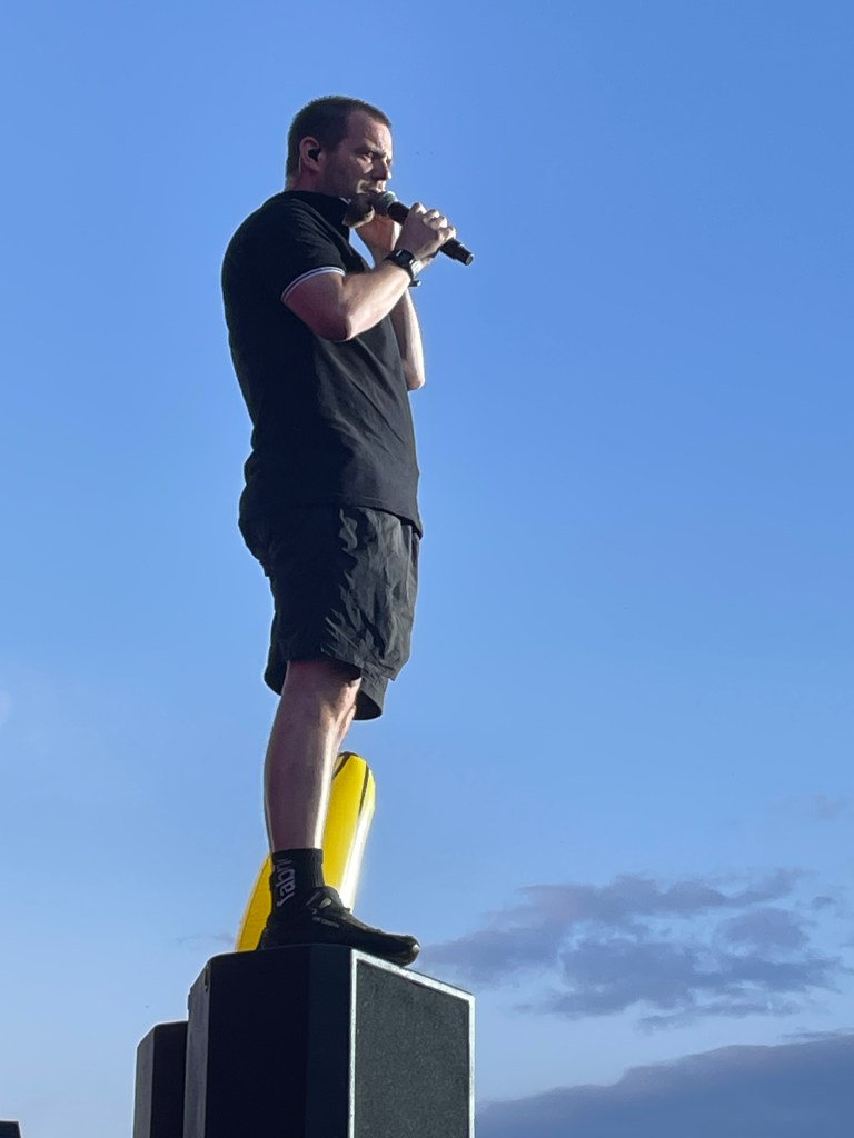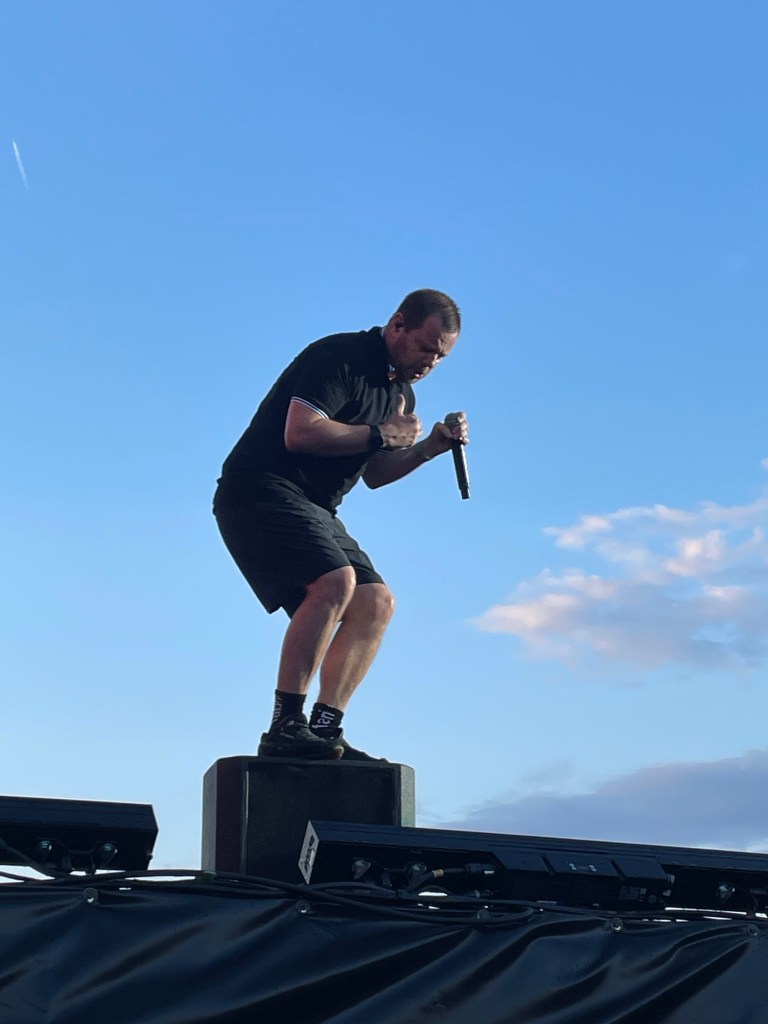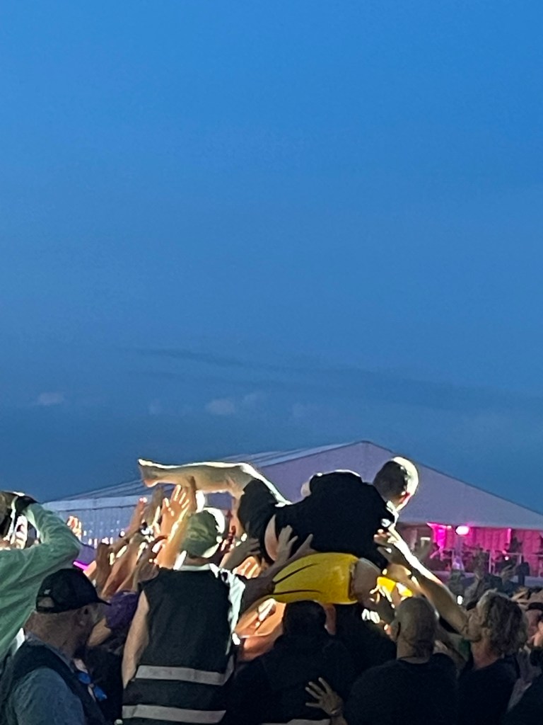 Mike said that he controlled the weather. They got a credit card from the festival. He lost it tho. And he really wanted a frites with mayonnaise. If he got a frites with mayo from someone, he’d keep the weather like it is now. He first got a credit card from a cameraman, but a security guard gave him a portion of frites with mayo. The cameraman got his creditcard back. And as Mike promised, the weather stayed good. Wayne waved at us as well. After the gig, a guy in a yellow tshirt got the setlists and threw them all away. Idiot.